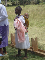 In Kenya there seems to be one way and it is simple and inexpensive. Plus I hear it’s a very comfortable way to carry a baby. What impressed me about this form of “baby handling” is how they get the baby onto their backs! It’s quite acrobatic and I thought for sure I’d see a baby falling to the ground. But even young girls carry their baby sister/brother around on their back and they do the same acrobatic dance.
