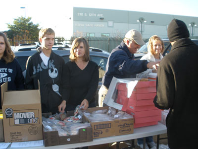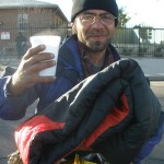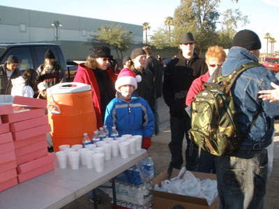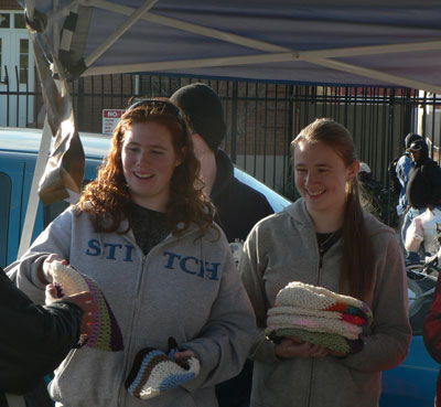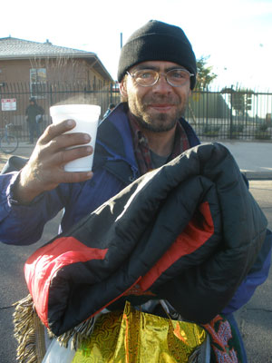 Then Christmas morning more volunteers came downtown with us to hand out hot chocolate, hot apple cider, cookies, donuts, blankets, socks, coats, gloves, beanies (hand crocheted!) and New Testaments. (click on photo for larger image)