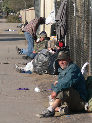 - Waiting in line for clothes, cookies, a hot drink and a New Testament